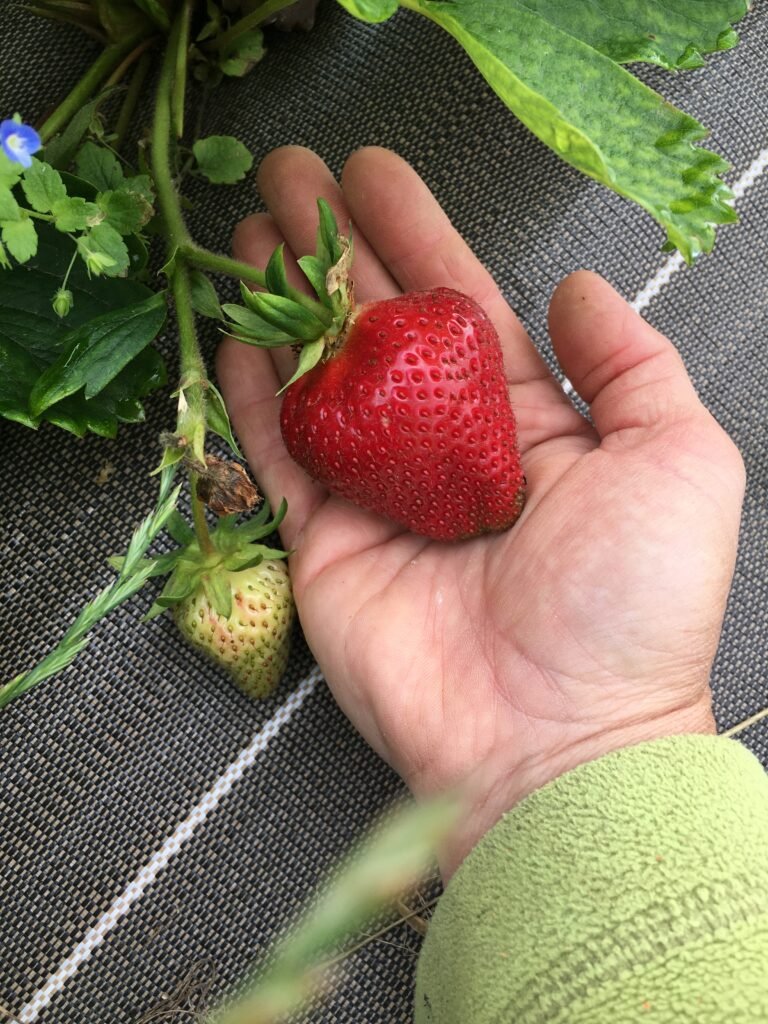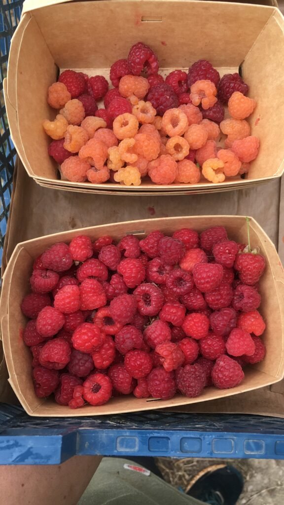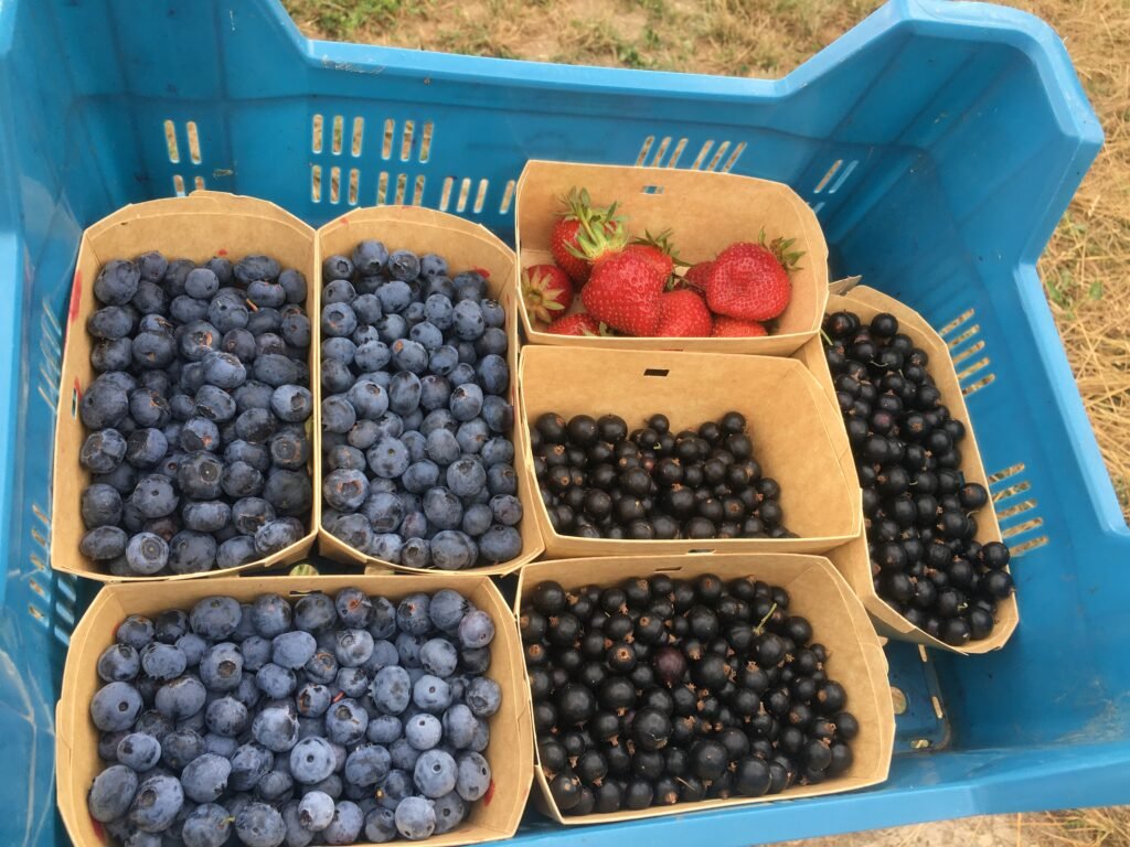 En haut du terrain exploité pour les deux ateliers, légumes et fruits, j’ai installé depuis 2024 plus de 1500 plants de petits fruits variés (framboises, cassis, groseilles, mûres; amélanches,…) et une fraiseraie de 2500 plants.